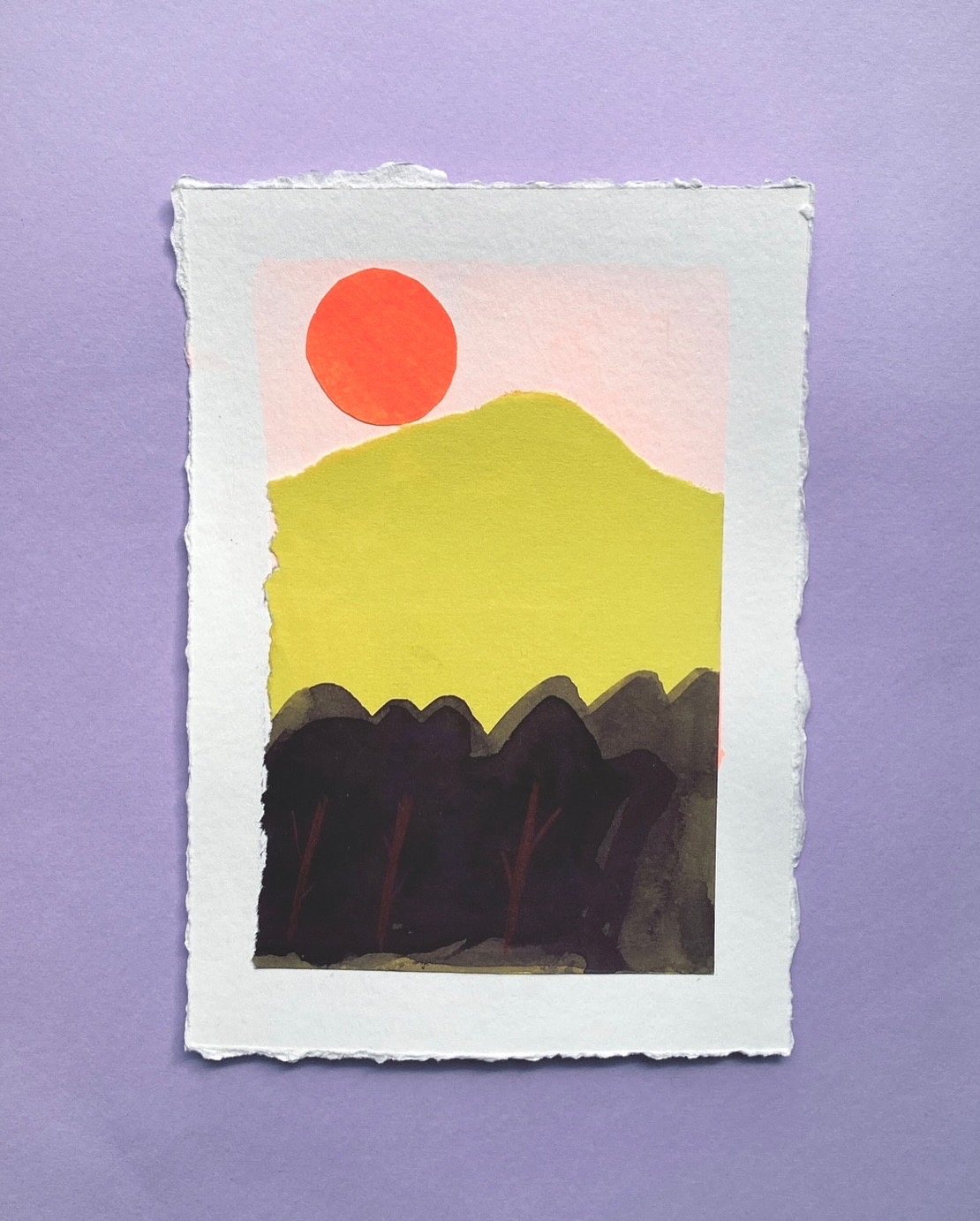 Encre fluo, encre végétale et gouache se superposent sur papier dans des collages au format carte postale, créant une composition vibrante et colorée.